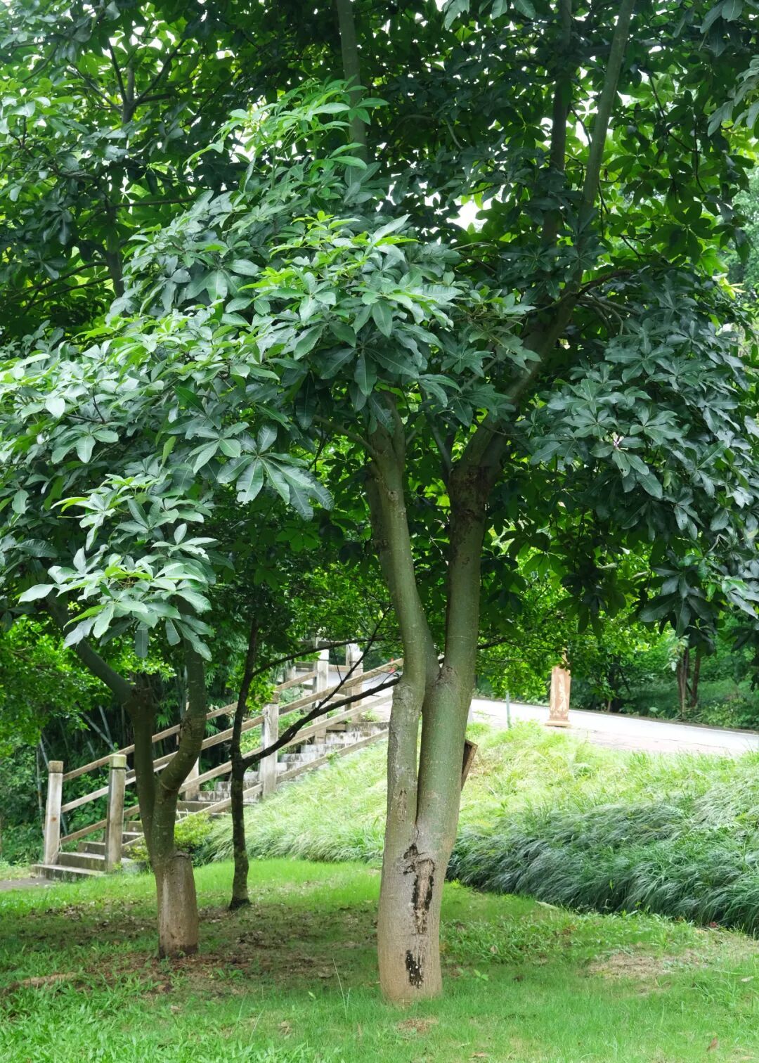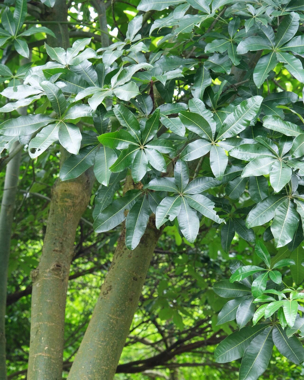 马拉巴栗高可达9~18米,树皮光滑,绿灰色,茎干基部常自然膨大如鼓槌状,肉质,甚为奇特,俗称发财树。通常用3株、5株、7株马拉巴粟植株编成辫子状后种植于盆中销售。叶为掌状复叶,革质,小叶4-7枚,长椭圆形或披针形,叶色深绿,光滑无毛,枝叶平展,潇洒婆娑。
