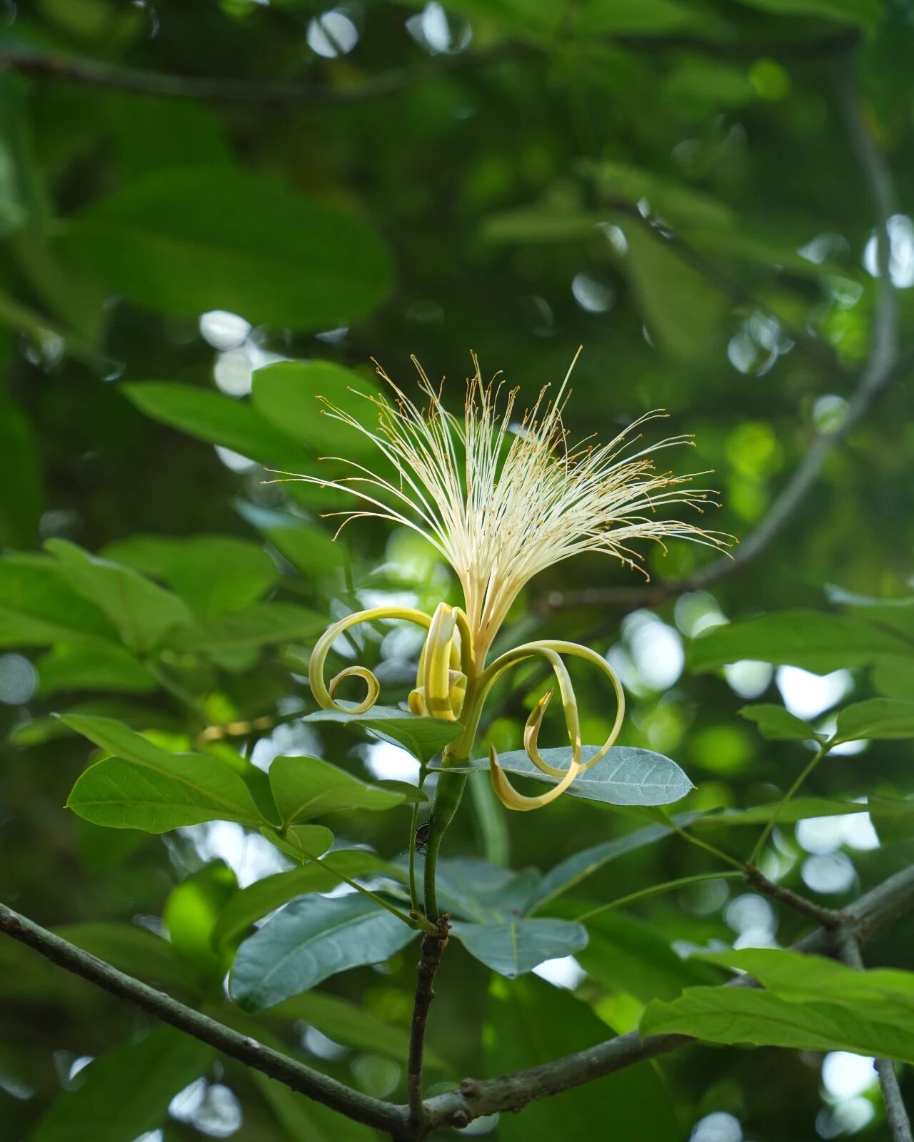 花期5~11月,花单生枝顶叶腋,花萼杯状,花瓣淡黄绿色,狭披针形至线形。雄蕊多数,基部合生成管,基部以上分离为多束,每束再分裂为7~10枚细长的花丝,花药肾形,花丝白色;子房5室,每室胚珠多数;花柱伸长,柱头5浅裂。
