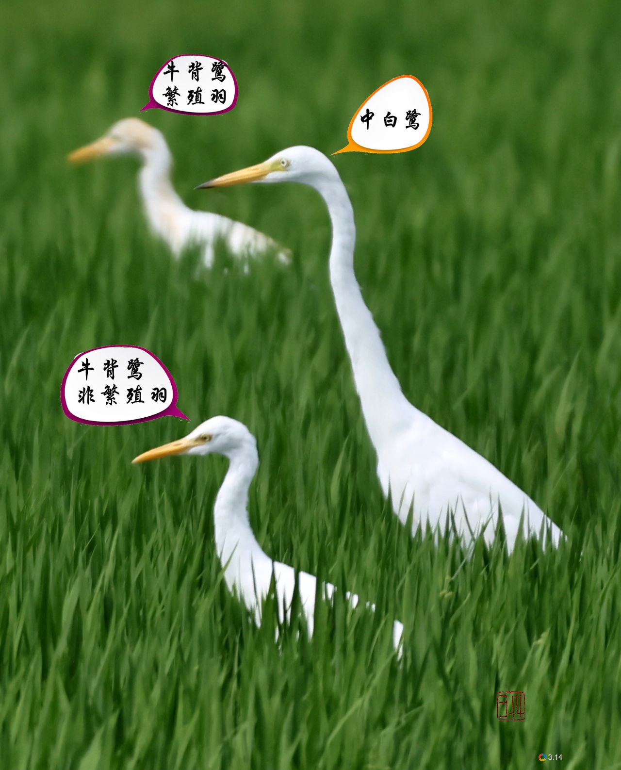 牛背鹭与中白鹭与是鹭科常见的鸟类,把它们含混地叫做白鹭,也没有什么大错。繁殖期的牛背鹭被繁殖羽,头颈部呈现橘黄色,与中白鹭明显不同,能够迅速辨别。但被非繁殖羽的牛背鹭,通体白色,在没有参照物的情况下易与中白鹭混淆,仔细看下图: