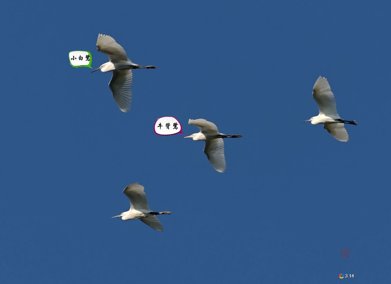 (小白鹭群中混入了一只牛背鹭,再仔细看,它们脚爪的颜色也是不同的)