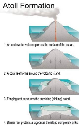大致来说,环礁的形成过程如下:1.海底火山喷发冲出海面;2.火山岛周围形成裙礁(紧贴海岸的珊瑚礁,岸礁);3.离岸的堡礁(与海岸隔离的环状礁体)环绕着正在沉降(或下沉)的火山岛;4.当火山岛完全沉没时,堡礁环绕着潟湖,最终形成环礁。